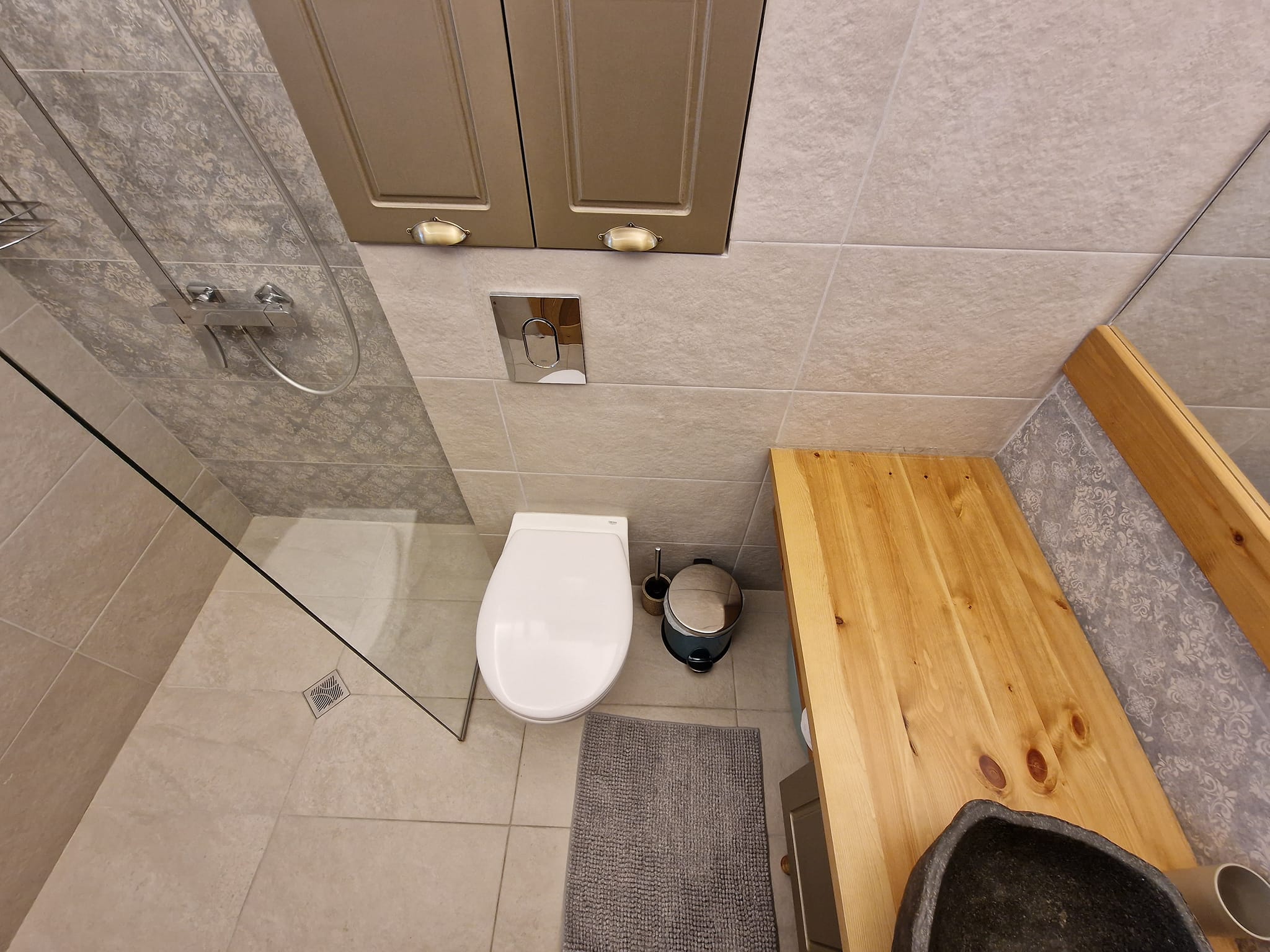 Дом застроенной площадью 104,09 кв.м., очень теплый и уютный, построен из качественных материалов. Высота потолков 5 метров. Внешне дом полностью изолирован в соответствии с современными требованиями и облицован камнем и деревом, что обеспечивает прохладу летом и тепло зимой. Вилла имеет собственную парковку.