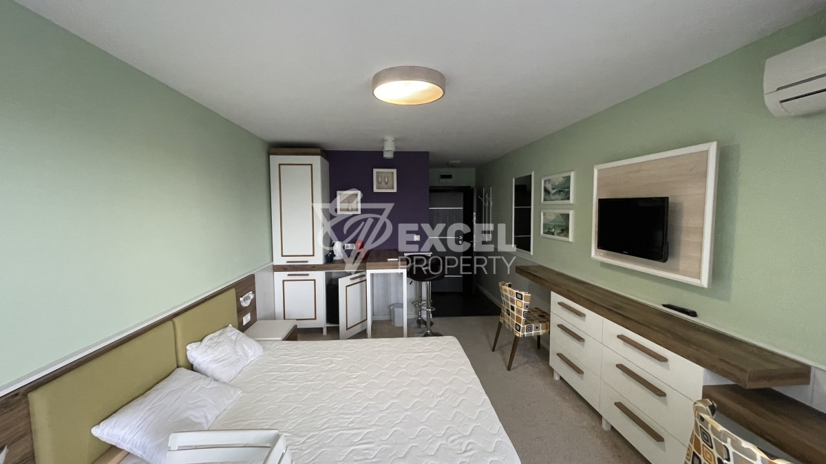 Ексель Проперти предлагает на продажу студию в комплексе Одисей. Недвижимость уютная и практически не использовалась, расположена на третьем этаже и имеет общую площадь 41 кв. м. Предлагается меблированной, как гостиничный номер - без кухни, но есть возможность ее оборудовать. Состоит из просторной гостиной, ванной комнаты с душевой кабиной и балкона. Из мебели - высокий обеденный стол с двумя стульями, две двуспальные кровати с прикроватными тумбочками и большой шкаф под телевизорм. Дополнительный уют придает ковровое покрытие на полу, ванная комната оборудована душевой кабиной, также имеется кондиционер. Терраса небольшая, выходит на восток и с видом на соседние комплексы и горы. Недвижимость предлагает прекрасную возможность для сдачи в аренду или круглогодичного проживания. Здесь комфортом могут разместиться до четырех человек. В комплексе есть АКТ 16, плата за обслуживание составляет 12 евро/м2.