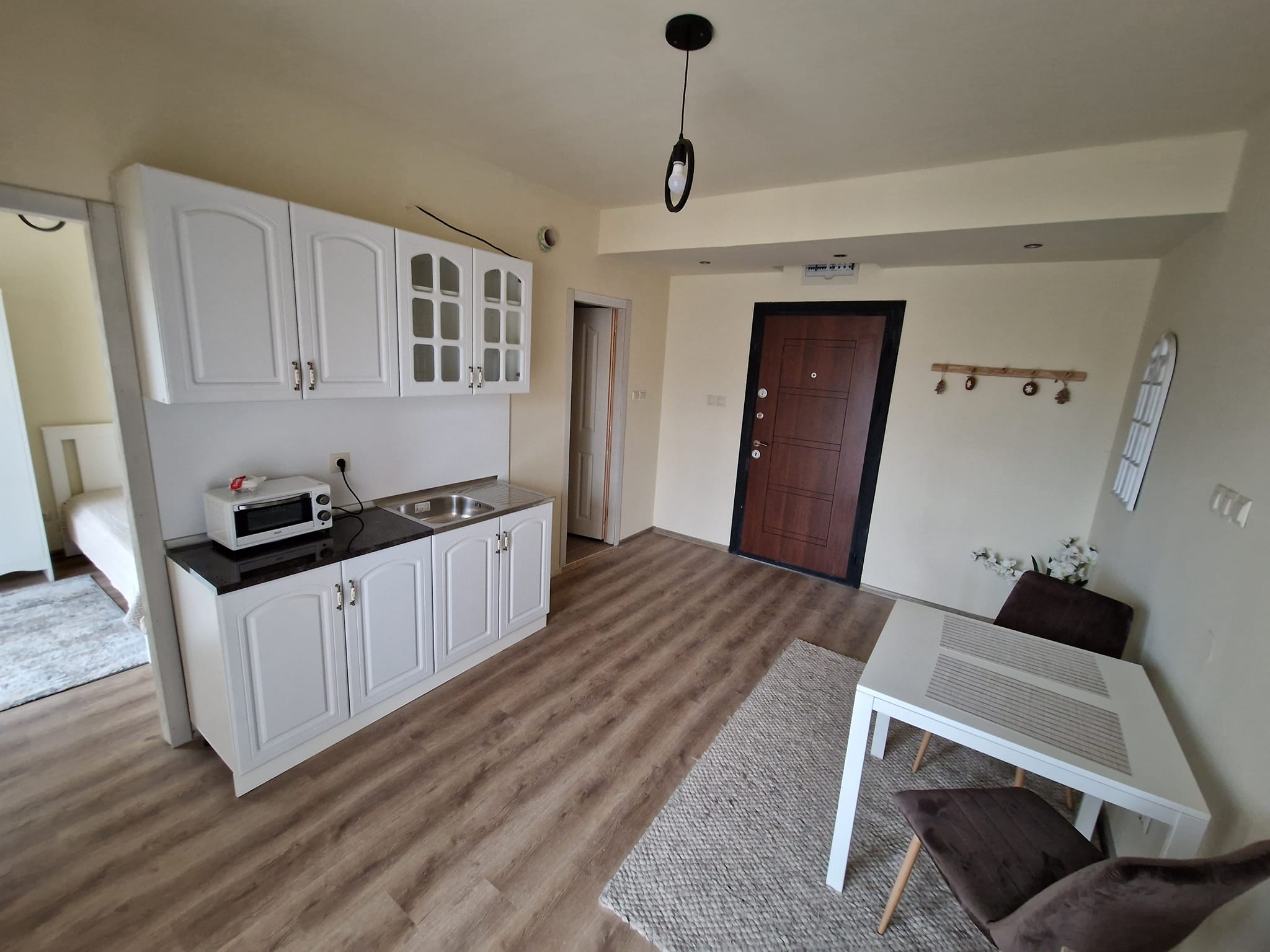 Квартира расположена на 2 жилом этаже, общей площадью 44 кв.м. и следующая планировка: гостиная с кухней. одна спальня, одна ванная комната с туалетом и терраса на западной стороне.