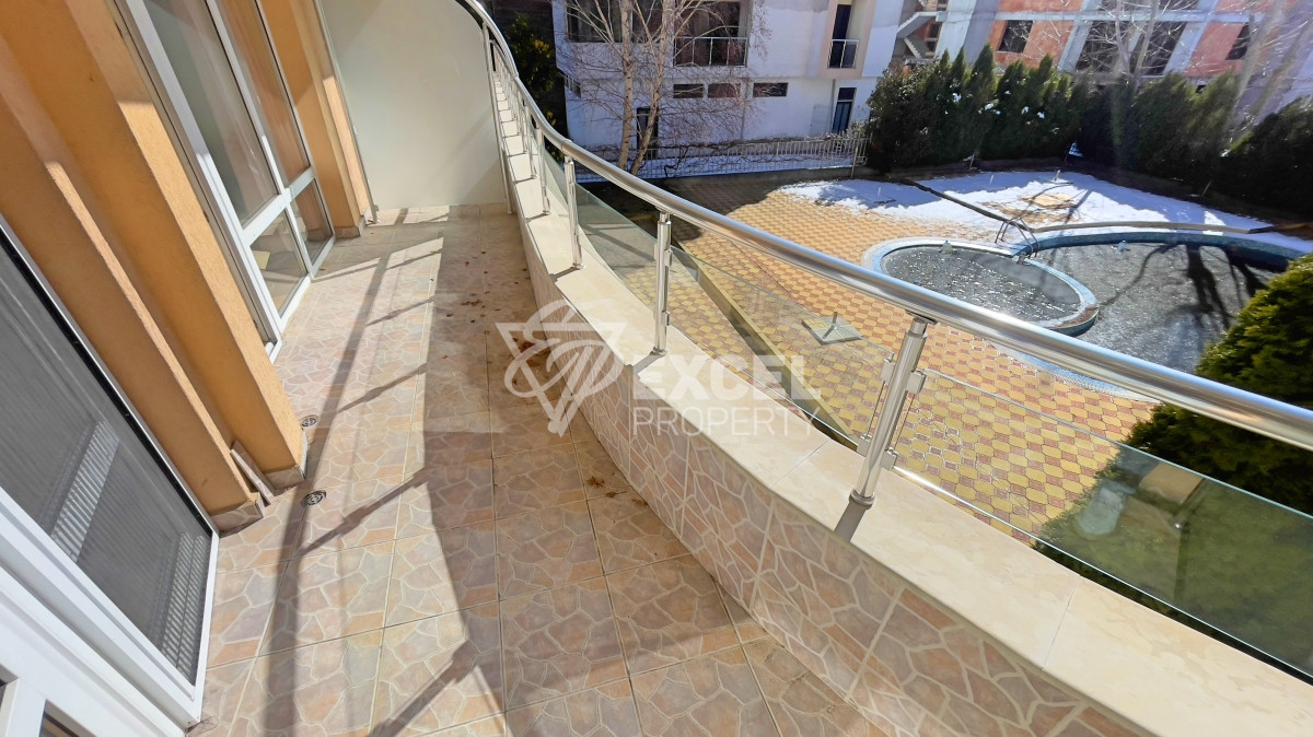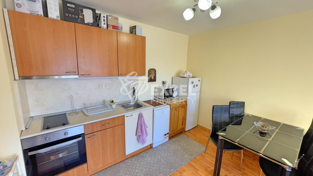 Ексель Проперти предлагает на продажу двухкомнатную квартиру в центральной части Солнечного Берега. Недвижимость светлая и солнечная, расположена на втором этаже и имеет общую площадь 72 кв. м. Предлагается меблированной и полностью оборудованной. Она состоит из прихожей, просторной гостиной, большой спальни, ванной комнаты и балкон. Мебель включает диван, односпальную кровать, обеденный стол с четырьмя стульями, кухню со всей бытовой техникой, включая посудомоечную машину. В спальне вы найдете двуспальную кровать с прикроватными тумбочками, шкаф и туалетный столик. В ванной комнате есть душевая кабина и стиральная машина, есть два кондиционера. Терраса хорошего размера с выходом из обеих комнат и видом на бассейн. Расположение южное, квартира средняя, без внешних стен, что делает ее пригодной для круглогодичного проживания. Недвижимость предлагает отличные возможности для сдачи в аренду. В ней легко могут разместиться до пяти человек. Комплекс имеет АКТ 16, плата за обслуживание составляет 8 евро/м2.