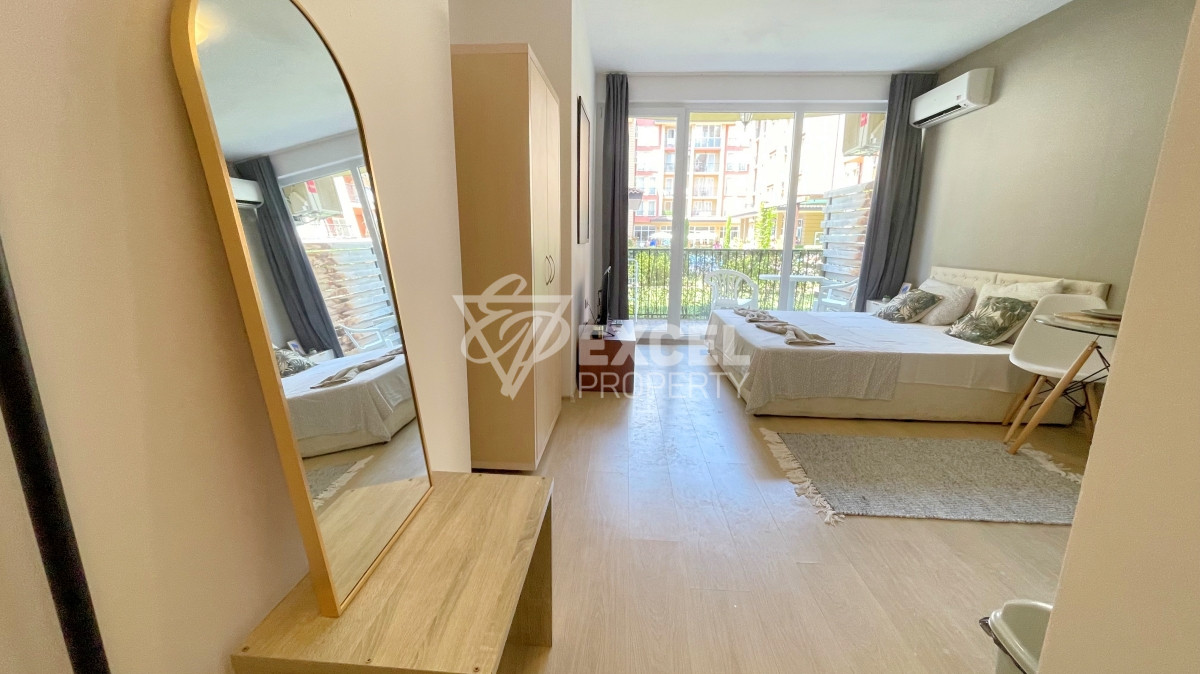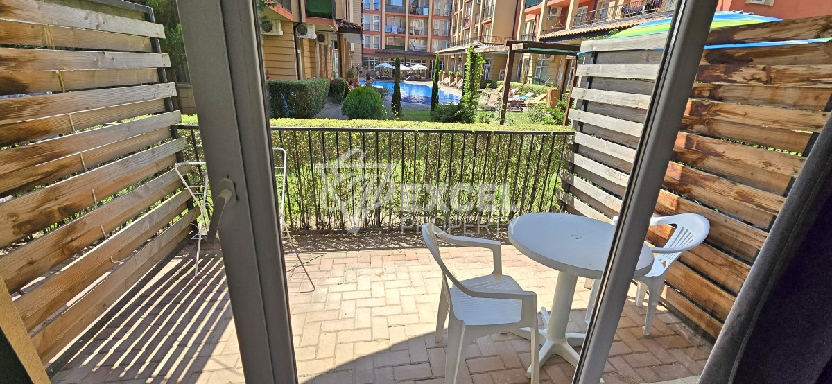 Ексель Проперти предлагает на продажу меблированную студию в комплексе Сани вю централ всего в 500 м от моря. Недвижимость светлая и солнечная, расположена на первом этаже и имеет общую площадь 35 кв. м. Недвижимость предлагается на продажу полностью меблированной и имеет мини-кухню, ванную комнату с душевой кабиной и прекрасную, большую веранду. Недвижимость после освежающего ремонта и предлагает уют и спокойствие. На мини-кухне есть плита, вытяжка и холодильник. Вы также найдете двое кровати с прикроватной тумбочкой, шкаф, обеденный стол с двумя стульями и тумба под телевизор. Ванная комната оборудована душевой кабиной, есть кондиционер. Балкон довольно большой и имеет место для стола со стульями и шезлонга. Студия выходит на бассейн, имеет западную ориентацию, и утро на балконе будет прохладным и приятным. В комплексе есть парковочные места, зарядные устройства для электромобилей, два бассейна, тренажерный зал, ресторан и приятный сад. Плата за обслуживание составляет 10,5 евро/м2, есть AКT 16.