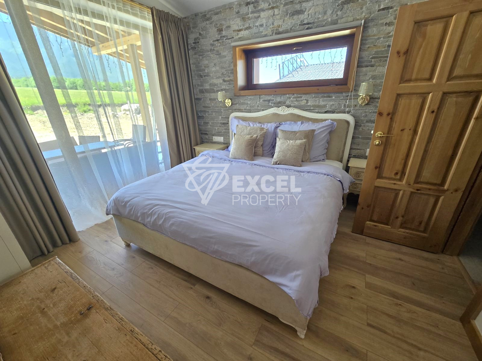 Планировка помещений: прихожая, подсобное помещение, просторная гостиная с камином, столовая и кухонная зона, три спальни, одна из которых хозяйская спальня со своей ванной комнатой и туалетом, вторая ванная комната с туалетом, веранда с барбекю и санузлом. большой двор (609 кв.м.). С веранды и гостиной дома открывается прекрасный панорамный вид на горы Пирин.