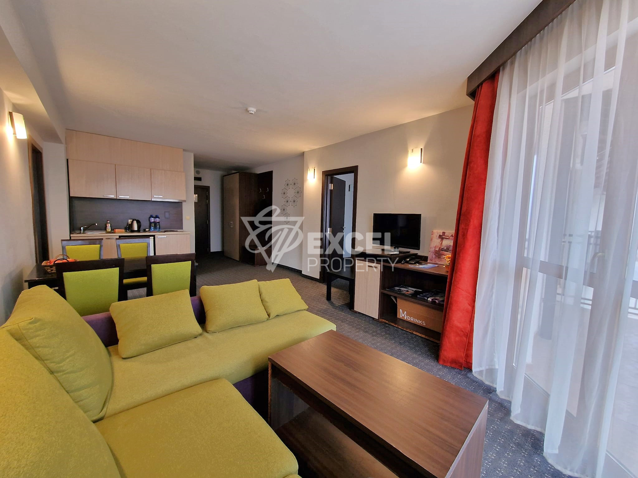 Распределение: прихожая, гостиная с кухней и столовой, 2 спальни, 2 ванные комнаты с туалетом и терраса с прекрасным видом на горы Пирин. Экспозиция восток-юг!