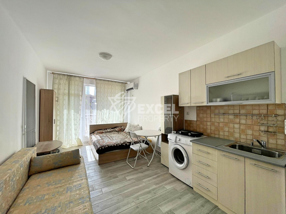 Предлагаем на продажу меблированную студию общей площадью в 29 кв.м. /чистая площадь-25м2/, расположенную на втором этаже /из 4-х/ в жилом комплексе Сани Дей 6. Недвижимость в отличном состоянии, в ней есть раскладной диван, раскладное кресло, кухонный бокс, оборудованный кухонными шкафами, холодильником, электроплитой и стиральной машиной, есть также чайник. Имеется ванная комната с туалетом, водонагревателем, душем и раковиной. Здесь есть все необходимое для полноценного проживания. С террасы открывается вид на зеленые зоны комплекса, на ней имеется внешняя мебель. Студия подходит для 3-х человек, так как есть и диван и кресло, установлен кондиционер и телевизор. Комплекс имеет Акт 16, такса за обслуживание составляет 580 Евро/год, работает круглый год, в нем есть несколько открытых бассейнов /5 бассейнов для детей и взрослых/, бар и ресторан вокруг большого бассейна, открытый с мая по сентябрь, супер маркет, несколько волейбольных и футбольных полей, теннисный корт; фитнес на открытом воздухе, зеленые зоны; сад; парковка и охрана. Комплекс находится примерно в 3 км. от пляжа, курортного города Солнечный Берег и города Несебр, автобусная остановка находится примерно в 900 м, а с мая по сентябрь комплекс предлагает мини-автобусы до каждого курортного города в этом районе.