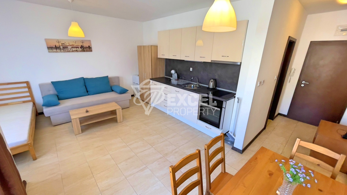 Ексель Проперти предлагает на продажу студию для круглогодичного проживания в Святом Власе. Недвижимость светлая и солнечная, расположена в комплексе Шипка и продается полностью меблированной. Она расположена на четвертом этаже и имеет общую площадь 43 кв. м. В ней есть прихожая, гостиная с кухней, ванная комната и балкон. Мебель включает в себя диван-кровать, двуспальную кровать, шкаф, журнальный столик, обеденный стол с четырьмя стульями и кухню со всей бытовой техникой, такой как духовка, плита, холодильник, вытяжка, телевизор и кондиционер. Балконе с северная ориентация и видом на горы. Здание предназначено для круглогодичного проживания, лифт работает и зимой. В комплексе есть AKT 16, бассейн и зона для шезлонгов и зонтиков. Плата за обслуживание составляет 10 евро/м2.