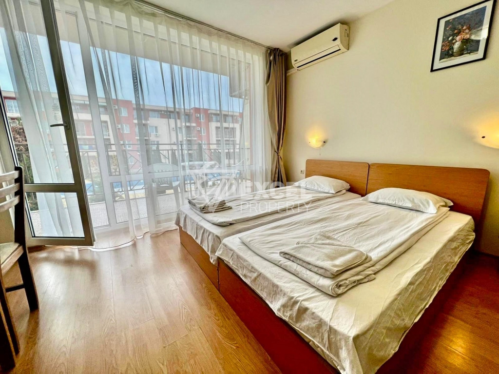 Предлагаем студию площадью в 42 кв.м. расположенную на 2-м этаже, которая состоит из прихожей, комнаты с кухонным углом и спальной зоной, ванной комнаты с туалетом и террасы с видом на зеленые зоны и один из бассейнов здания.