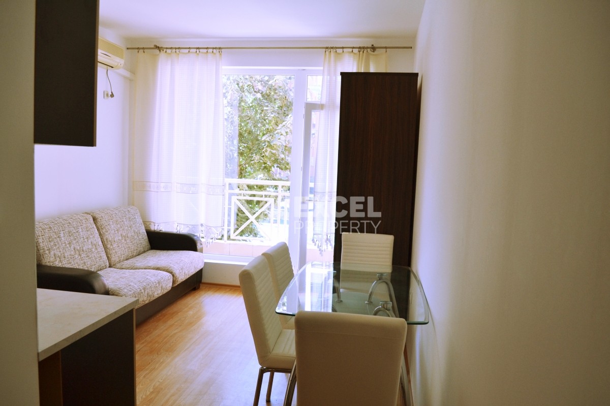 Предлагаем на продажу однокомнатную квартиру-студию, общей площадью 28м2 /по документам/, на втором этаже. Студия с видом на бассейн и террасой. Недвижимость в хорошем состоянии, есть кухонный уголок: плита, холодильник, кухонные шкафы, чайник; есть раскладной диван на 2-x человек, шкаф для одежды, стол с 3-мя стульями; Ванная комната оборудована раковиной, водонагревателем и душевой кабиной. Студия имеет террасу, которая летом используется как зона отдыха, с мебелью, с которой открывается прекрасный вид. В квартире один кондиционер.