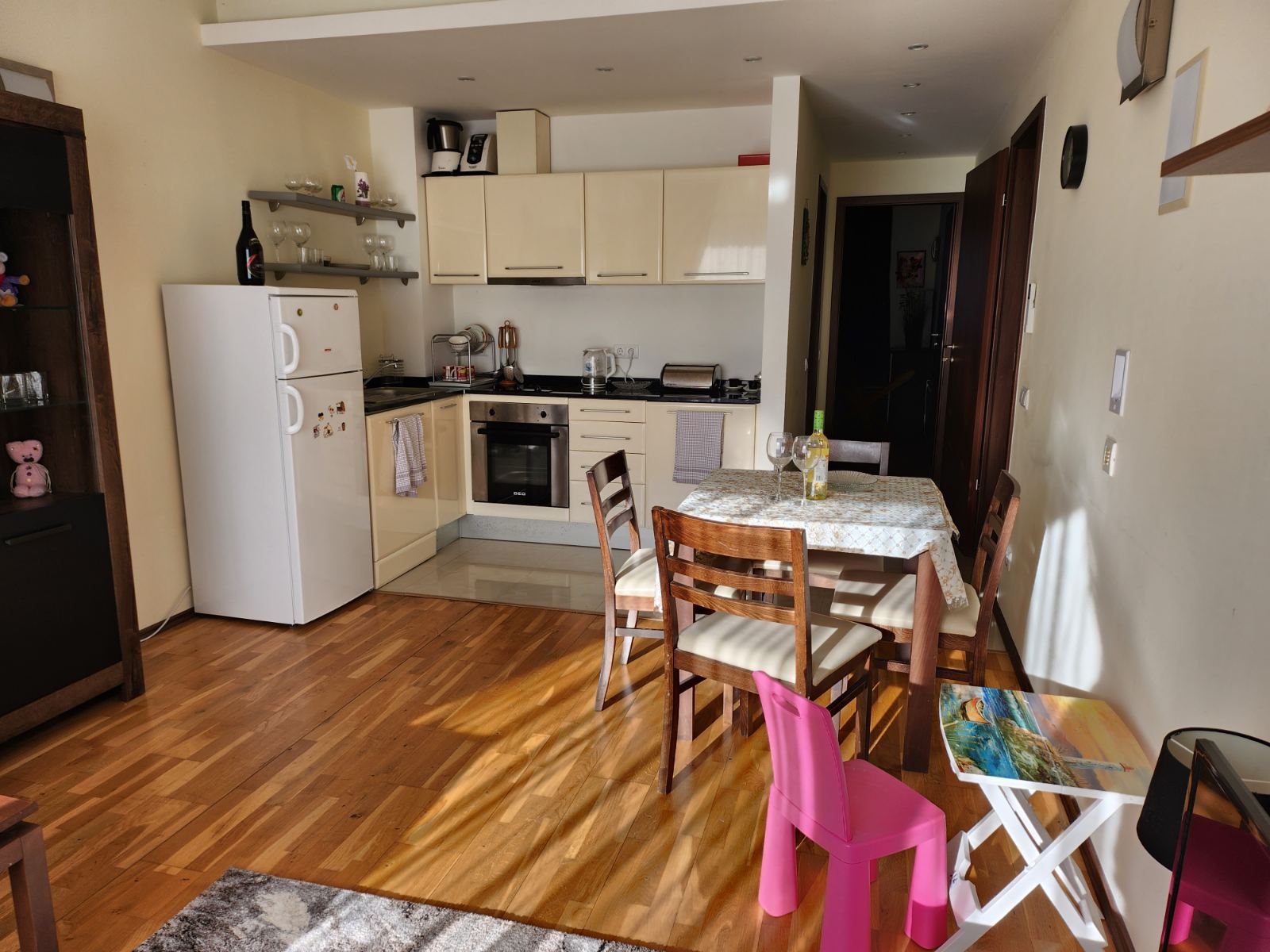 Недвижимость расположена на первом жилом этаже и имеет южную экспозицию. Он имеет прихожую, современно обставленную просторную гостиную с полностью оборудованной кухонной зоной, зоной отдыха и обеденной зоной, две отдельные спальни, две ванные комнаты с туалетом и террасу, выходящую на юг.