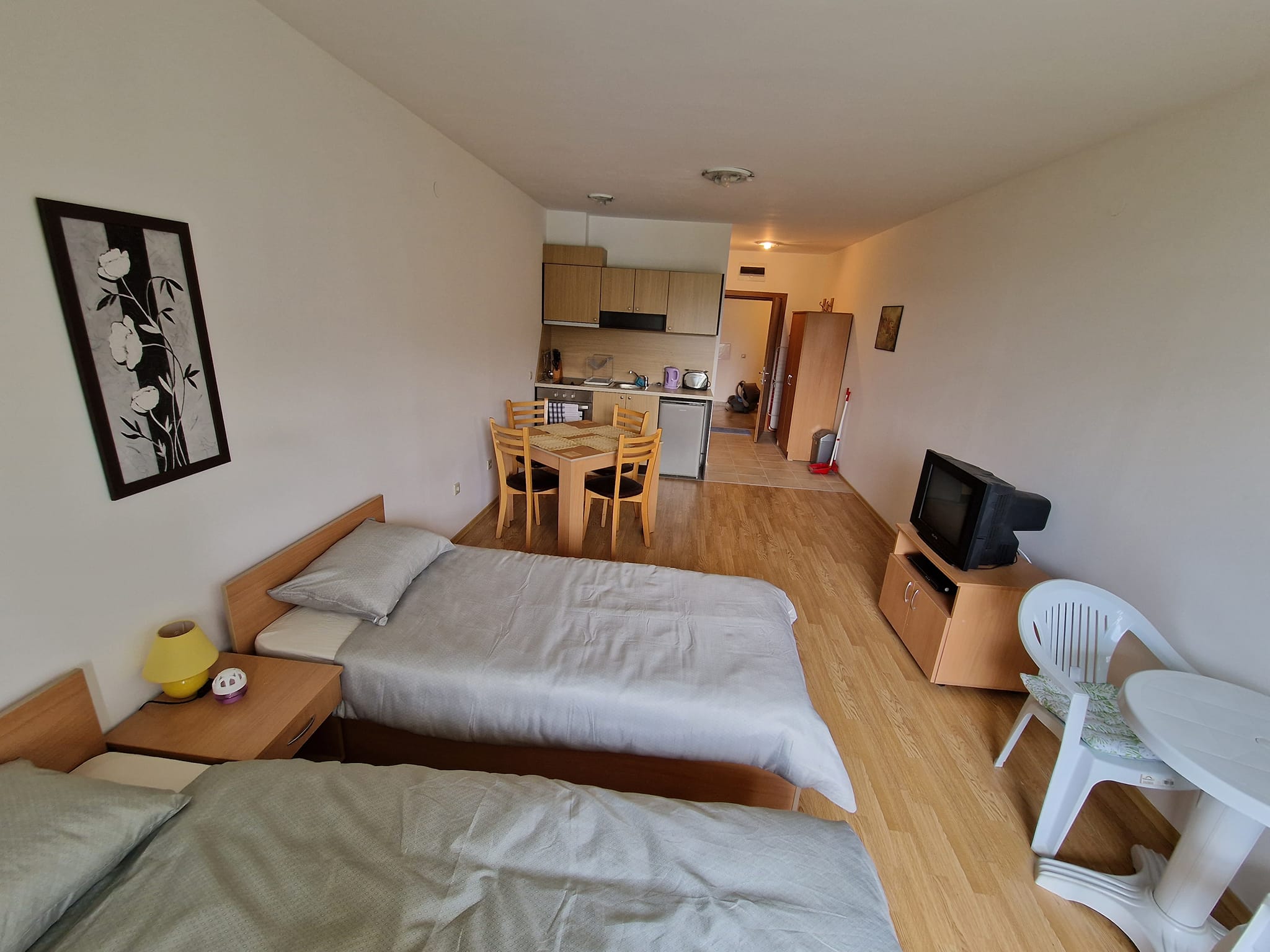 Excel Property представляет Вашему вниманию на продажу стандартную студию с террасой в комплексе Aspen Valley. Расположен на 2 этаже площадью 44 кв.м. и северная экспозиция с прекрасным видом на бассейн. Мебель в кухонном уголке включает в себя - встроенную плиту, холодильник, раковину, вытяжку, тостер и электрочайник; гостиная – стол с четырьмя стульями, комод и шкаф; меблированная спальня с телевизором. Туалет с ванной комнатой с ванной. Отопление электрическими радиаторами. Отделка дома - стены - латекс, пол - ламинат, терракота и столярные изделия из ПВХ. В здании есть лифт.